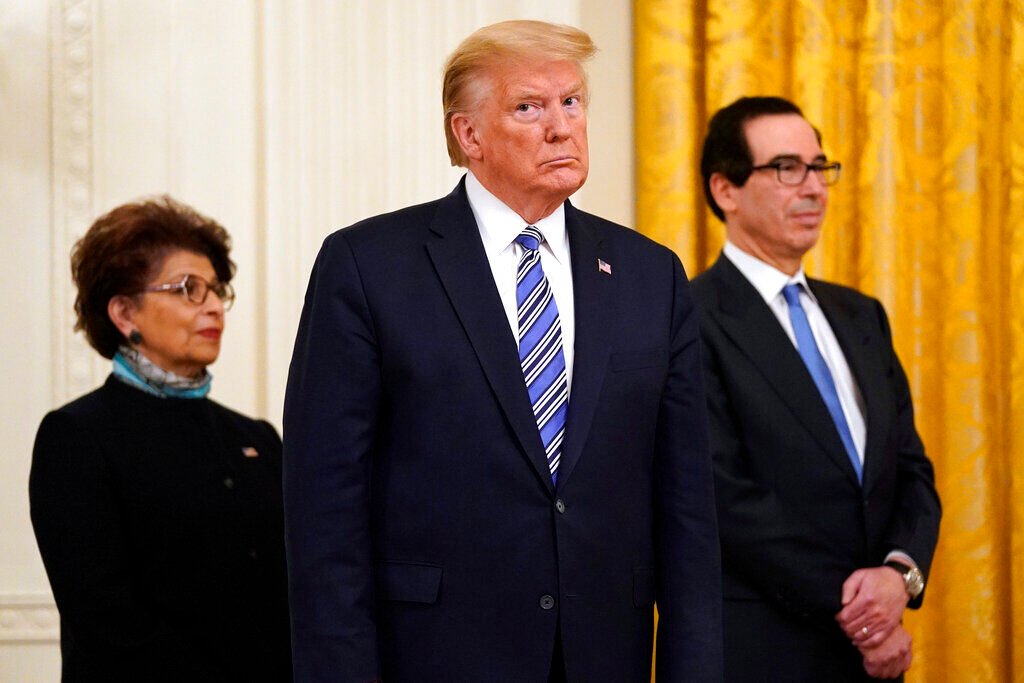 In this April 28, 2020 file photo President Donald Trump, along with Jovita Carranza, administrator of the Small Business Administration, and Treasury Secretary Steven Mnuchin listen during an event about the Paycheck Protection Program used to support small businesses during the coronavirus outbreak, in the East Room of the White House in Washington.